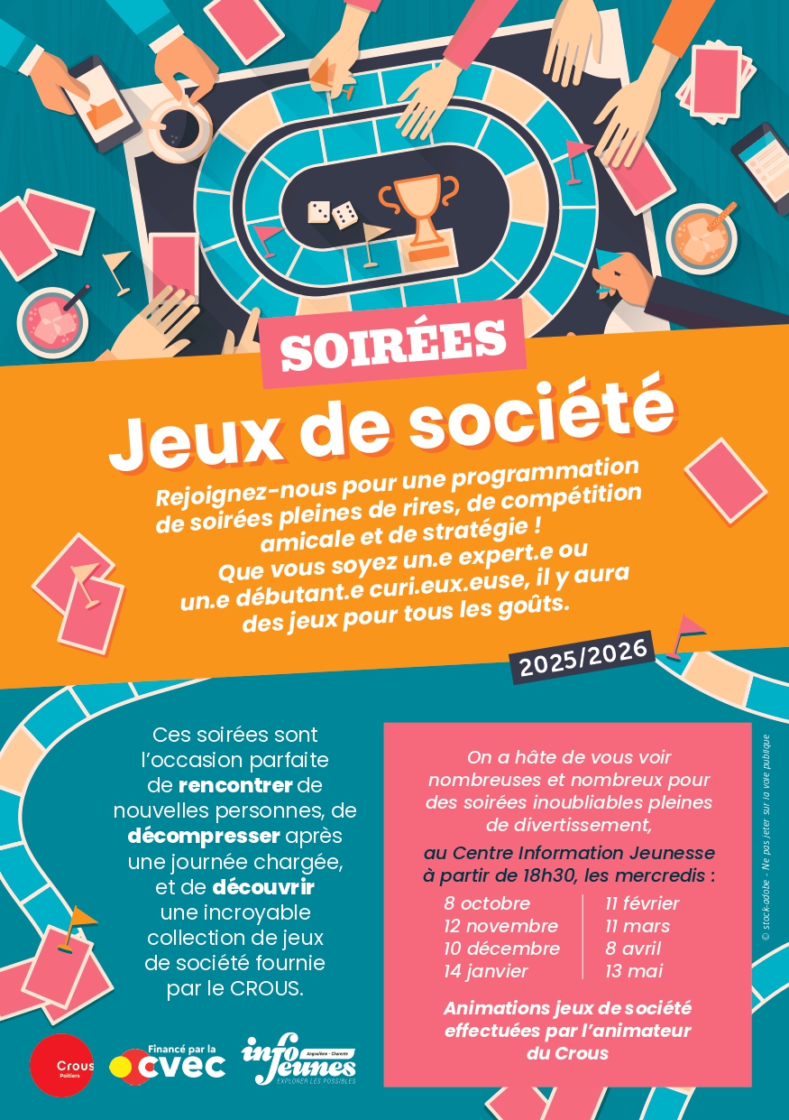 Chaque 2ᵉ mercredi du mois, le CROUS et le CIJ d'Angoulême vous invitent à partager des soirées jeux de sociétés, placées sous le signe de la bonne humeur, de la stratégie et de la convivialité.